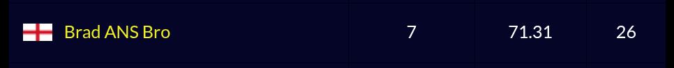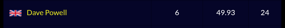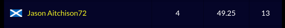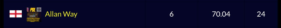 In the overs we have Allan Way taking the winning spot winning £50 with runner up BradansBro winning £25, Allan playing 6 out of the 8 and Brad 7 out of the 8 series